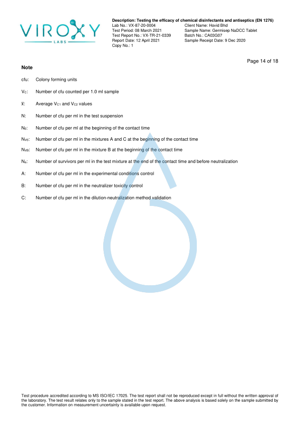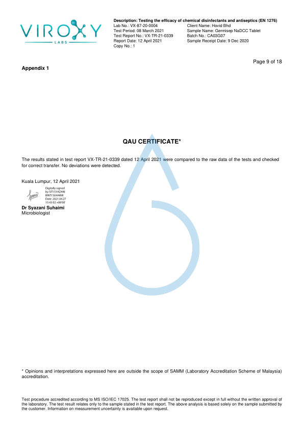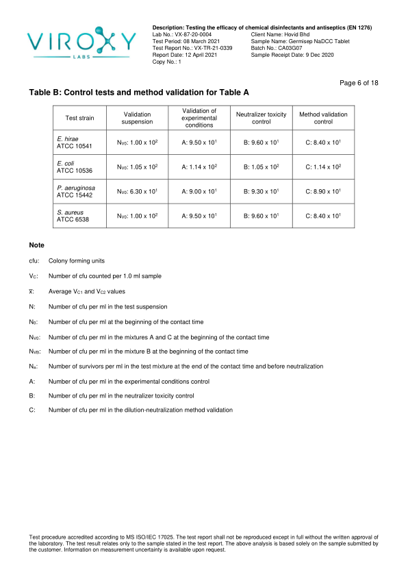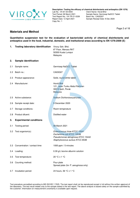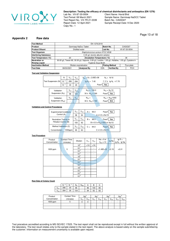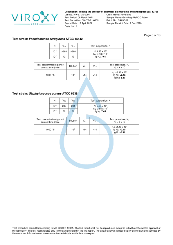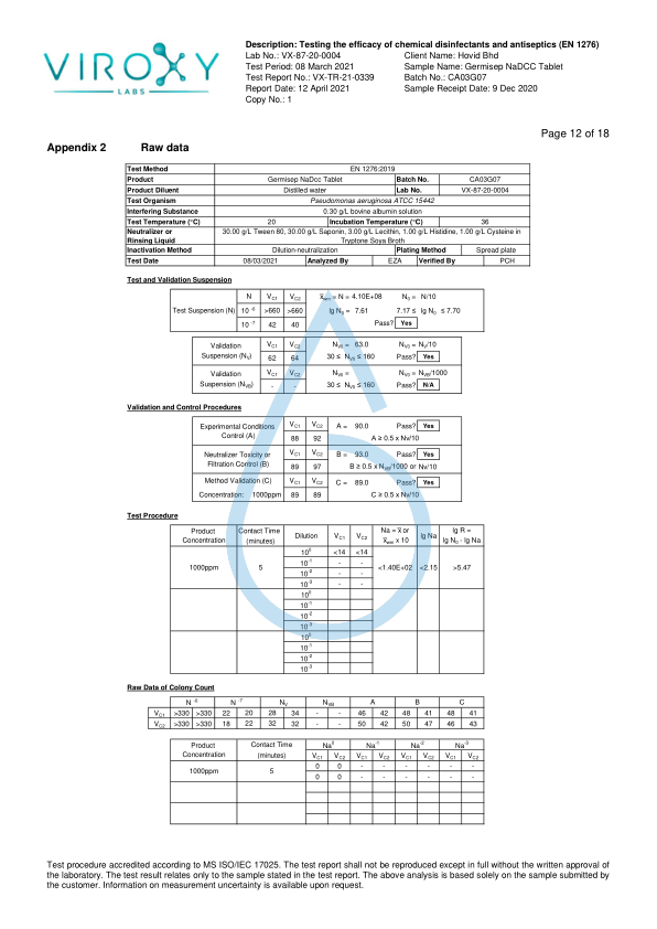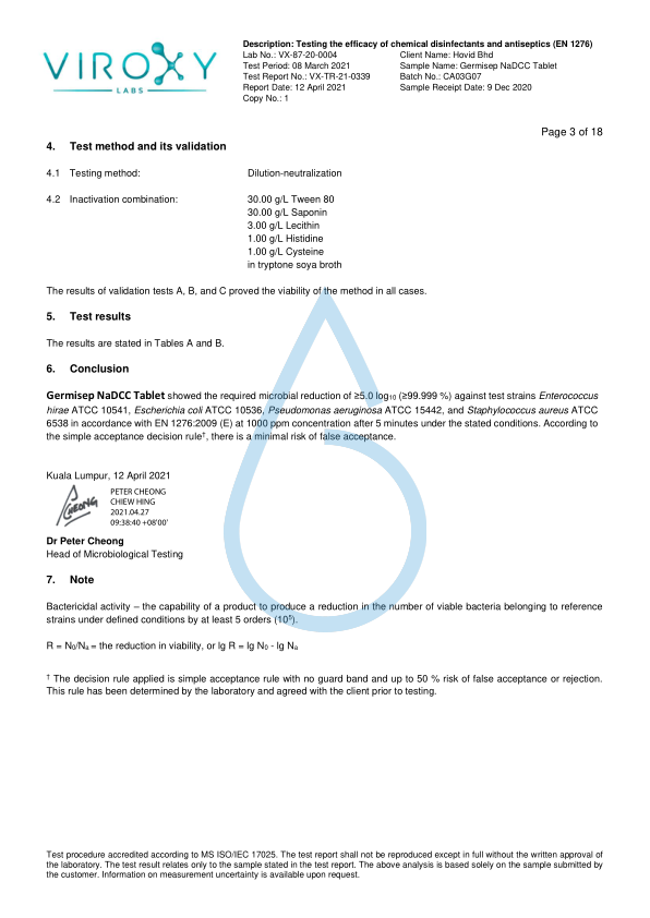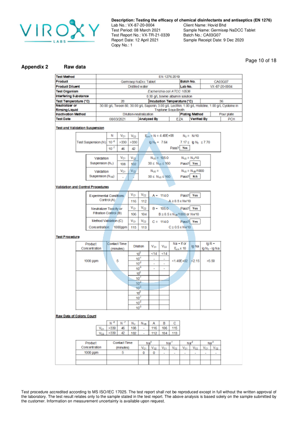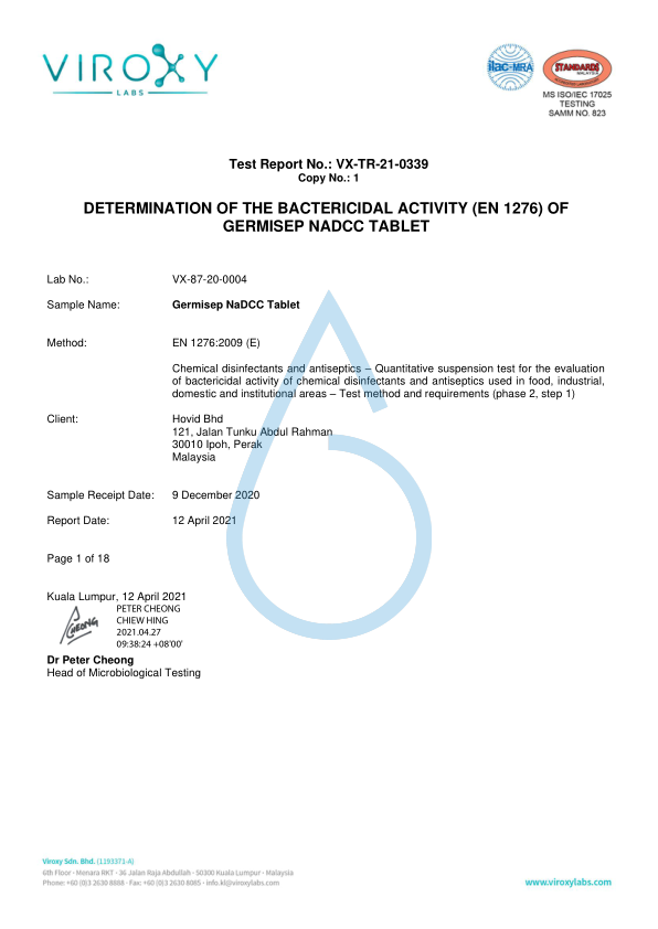 DETERMINATION OF THE BACTERICIDAL ACTIVITY (EN 1276) OF GERMISEP NADCC TABLET