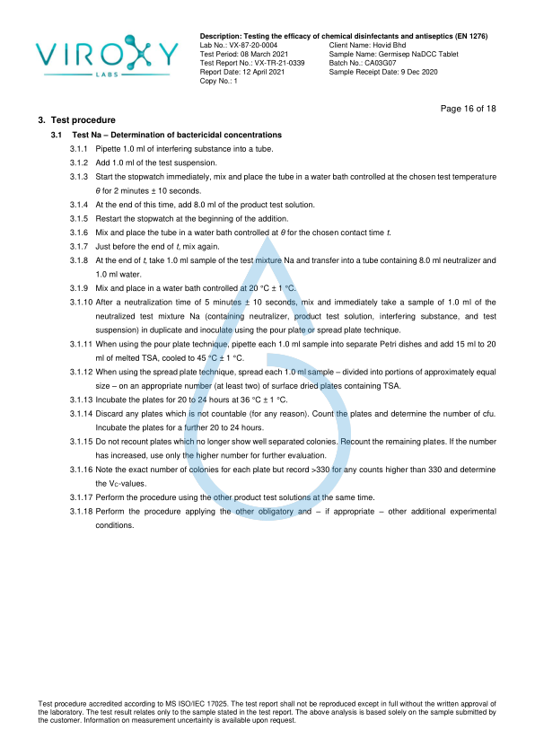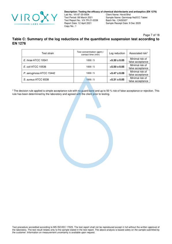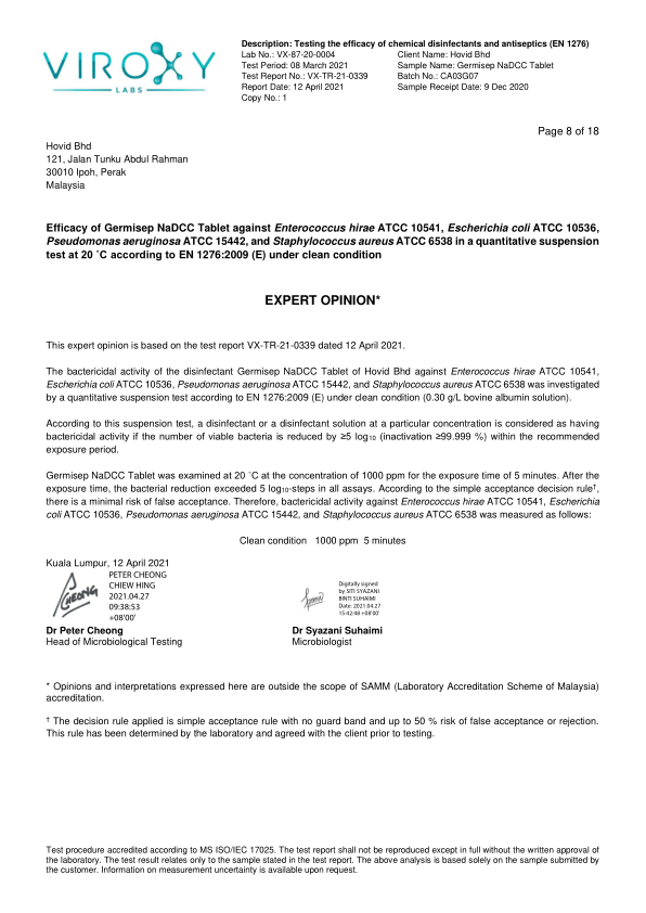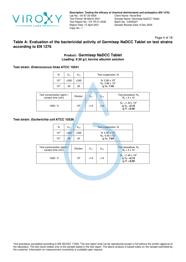 DETERMINATION OF THE BACTERICIDAL ACTIVITY (EN 1276) OF GERMISEP NADCC TABLET - Germisep