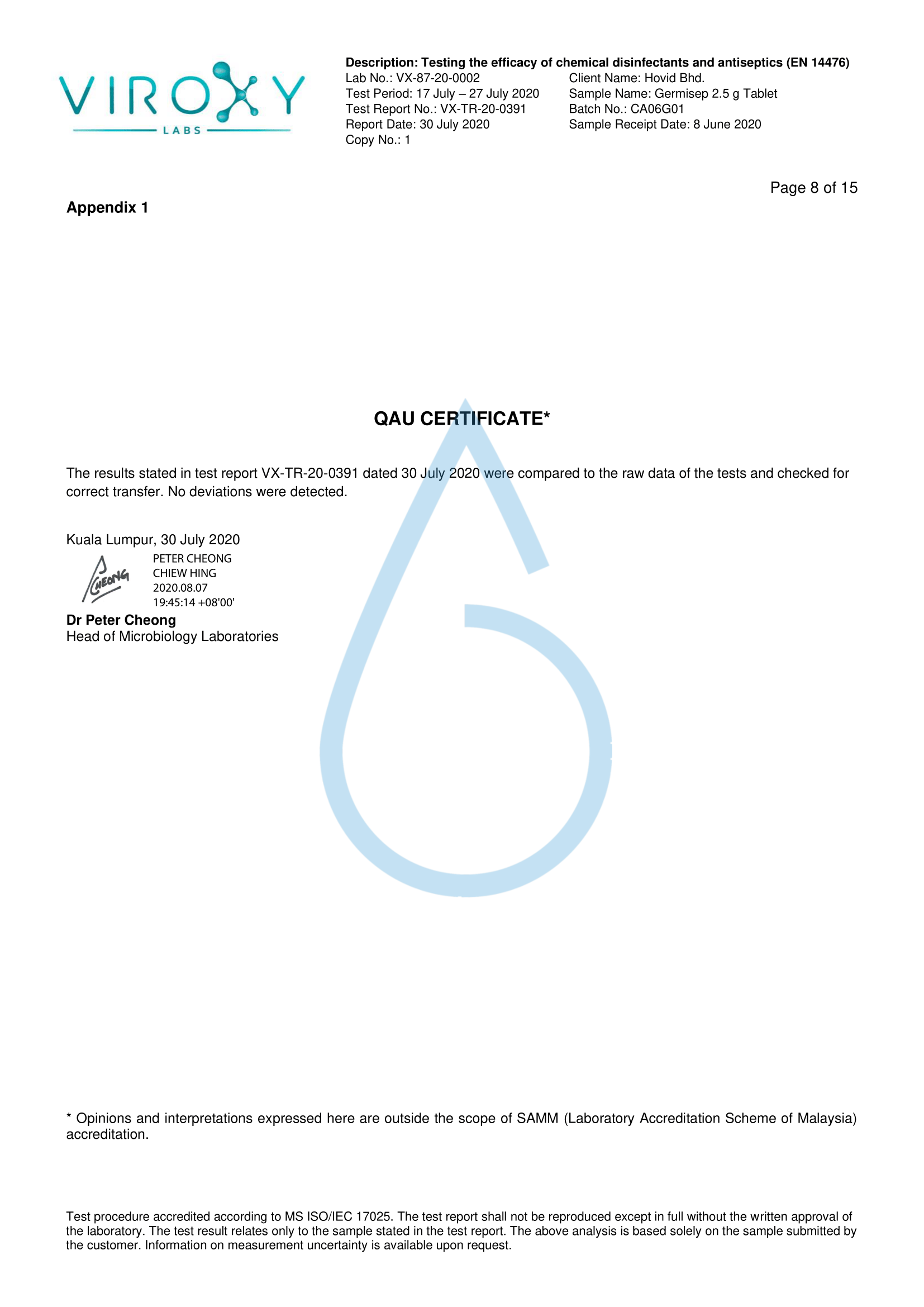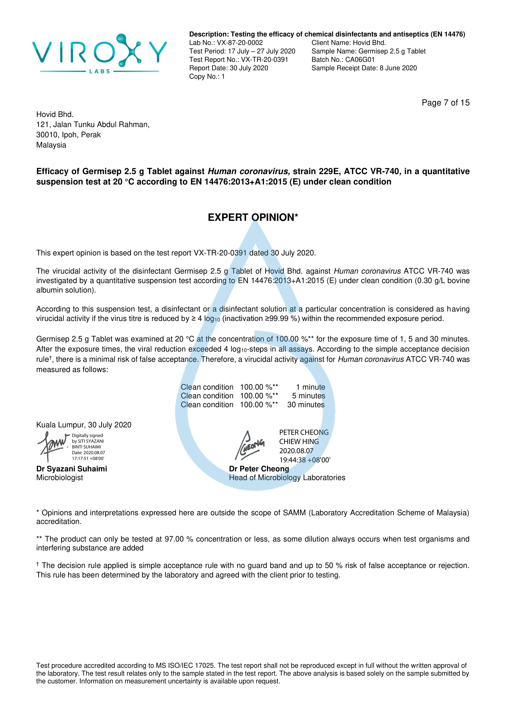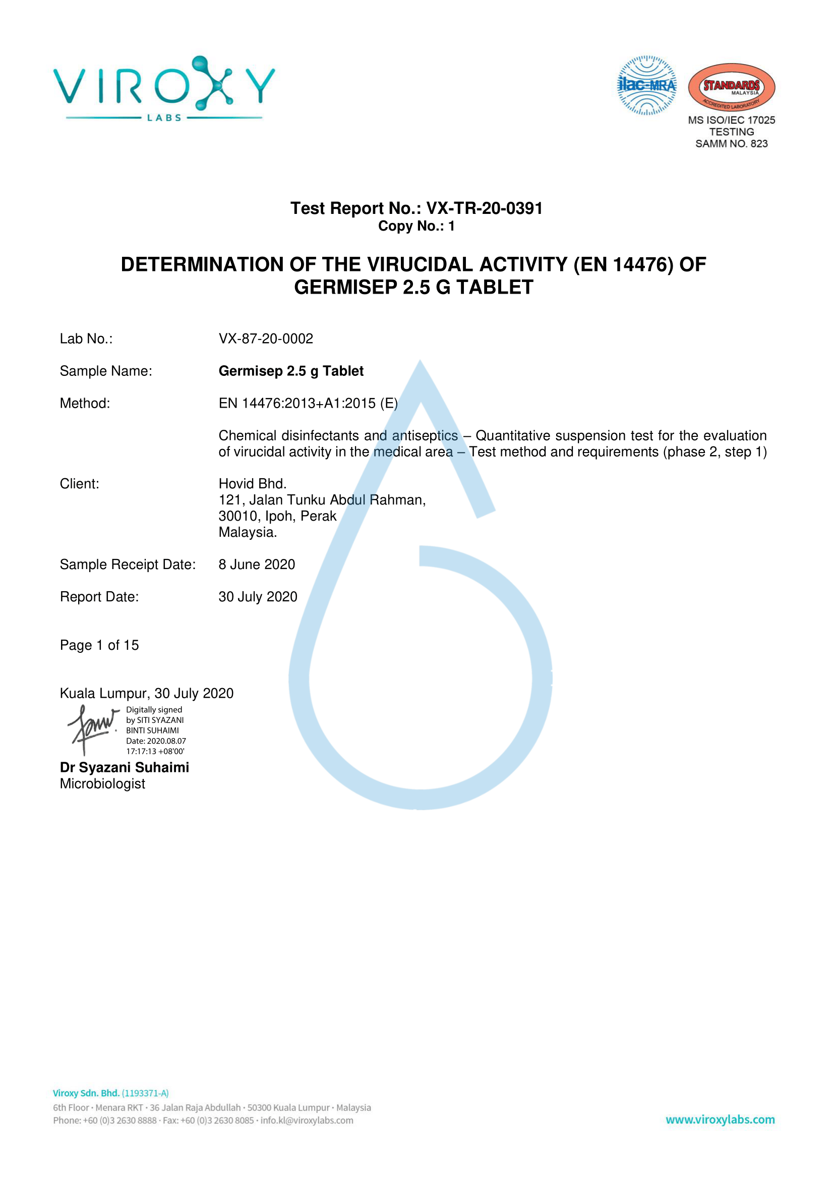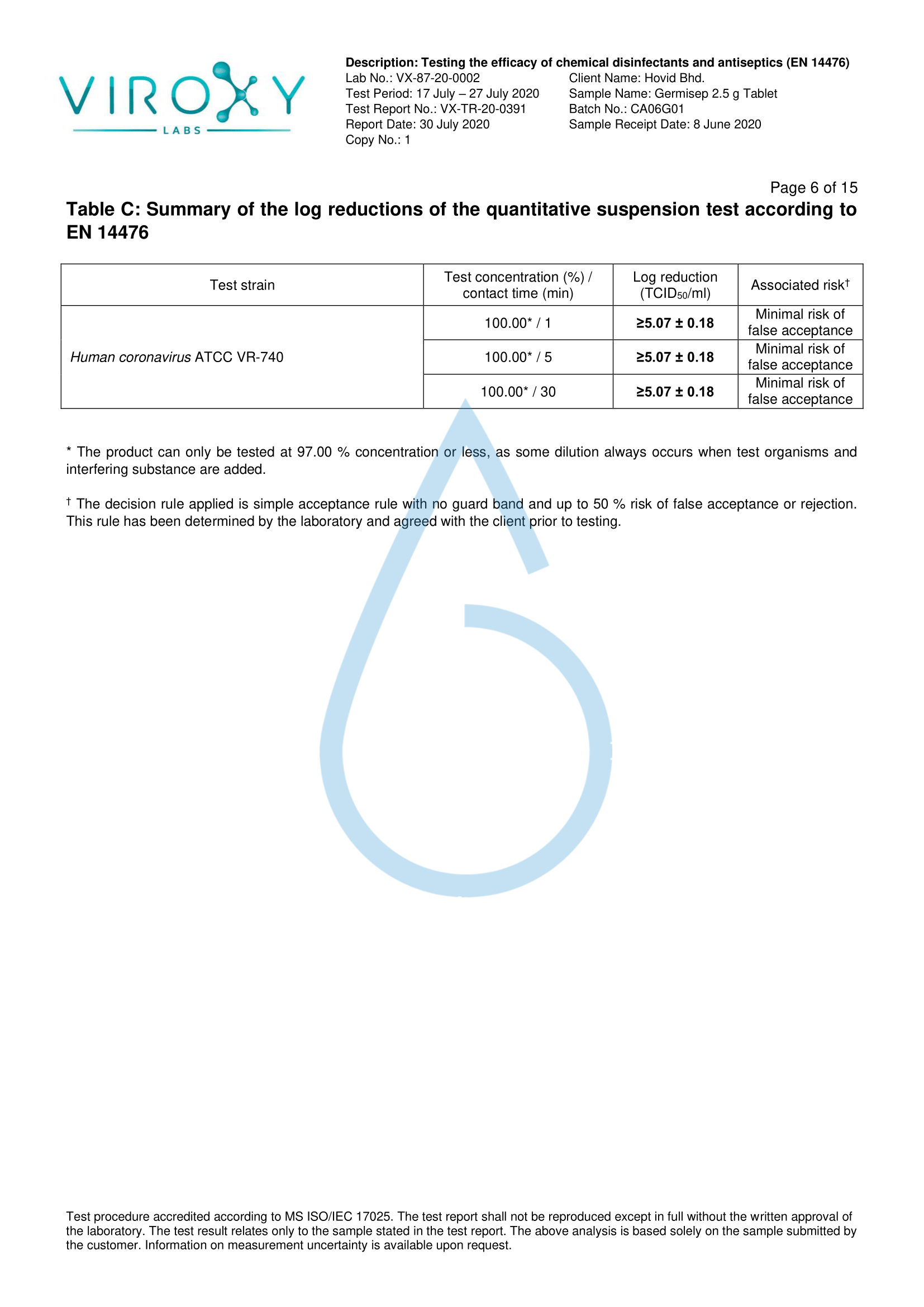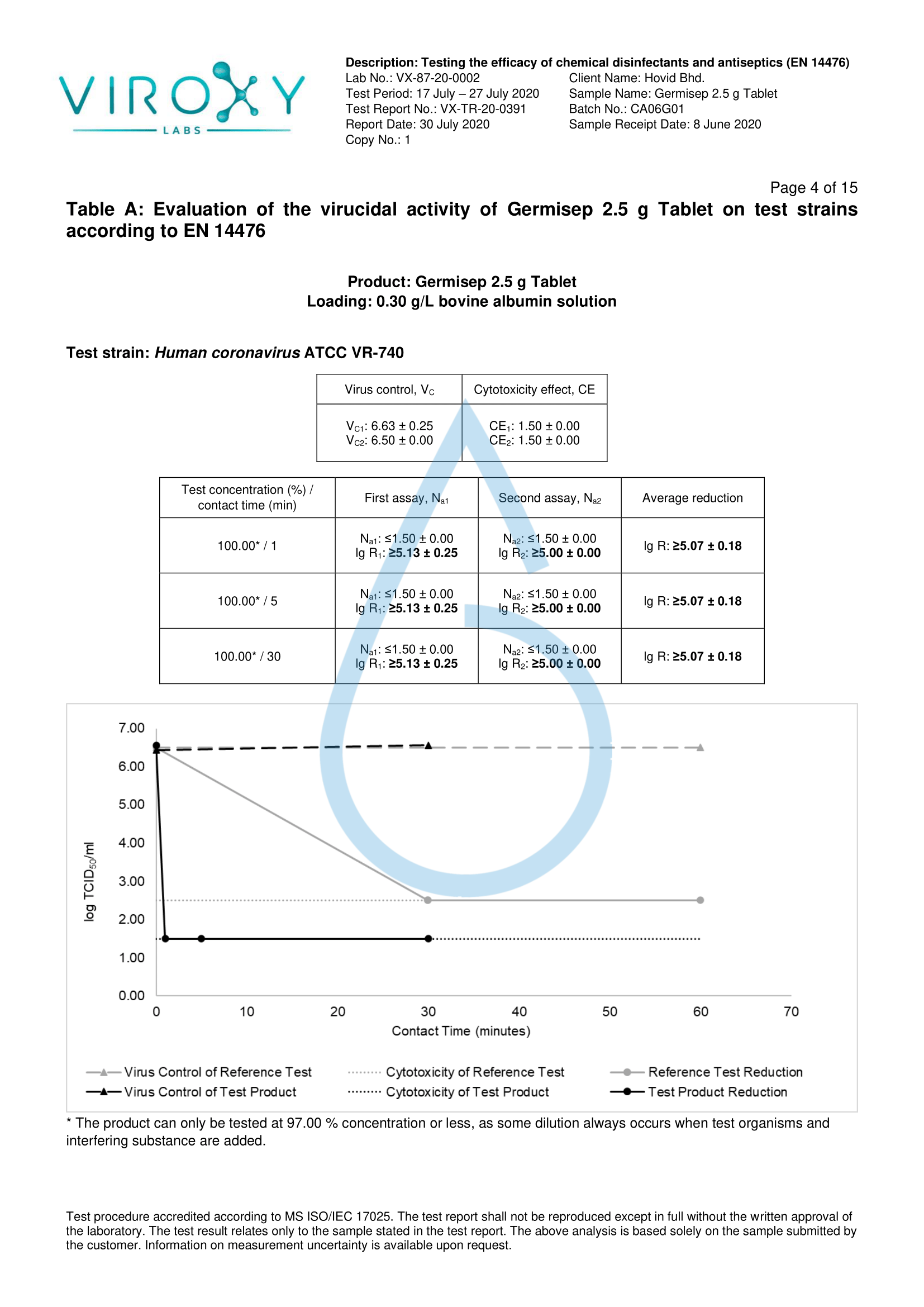 DETERMINATION OF THE VIRUCIDAL ACTIVITY (EN 14476) OF GERMISEP 2.5 G TABLET - Germisep