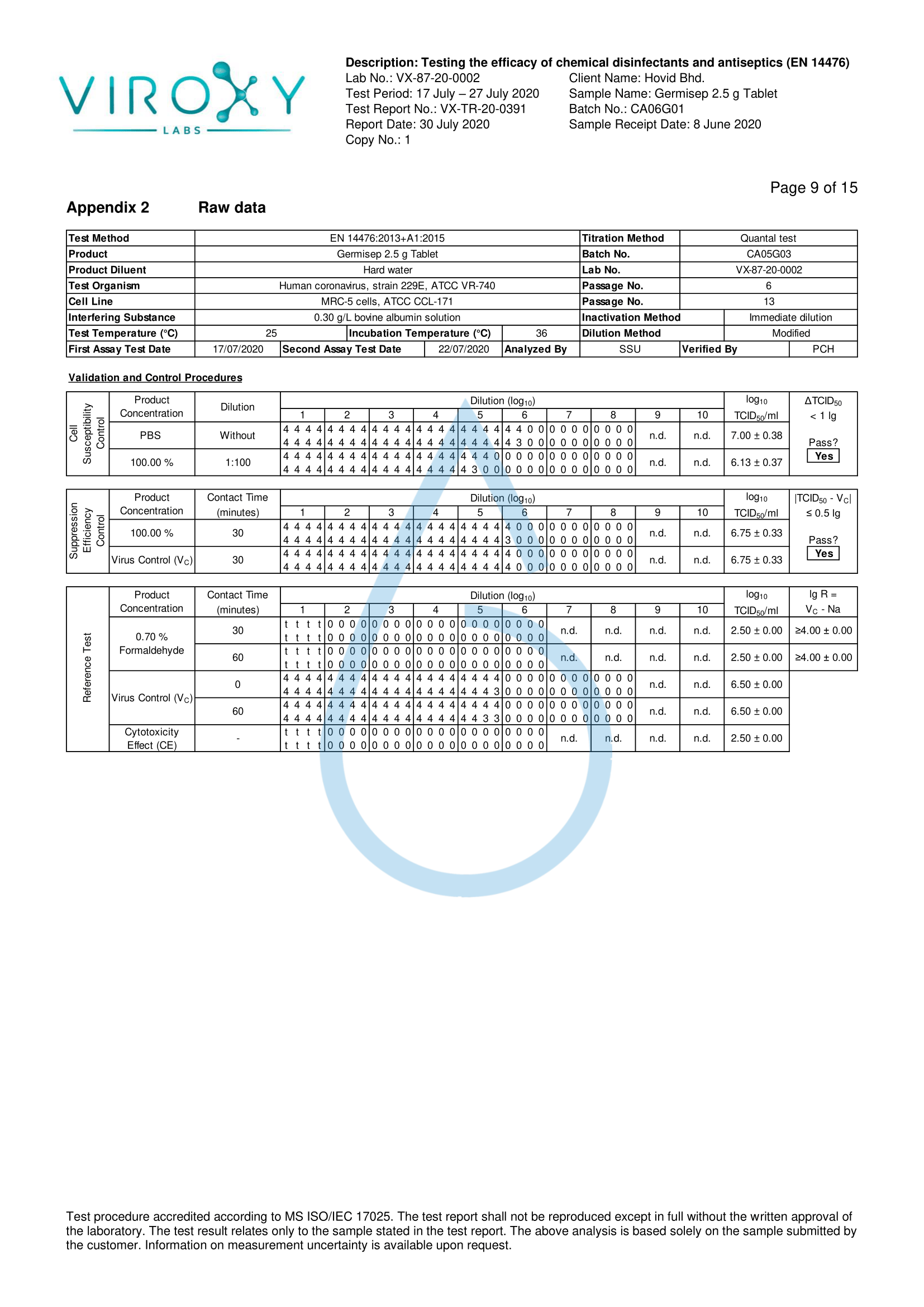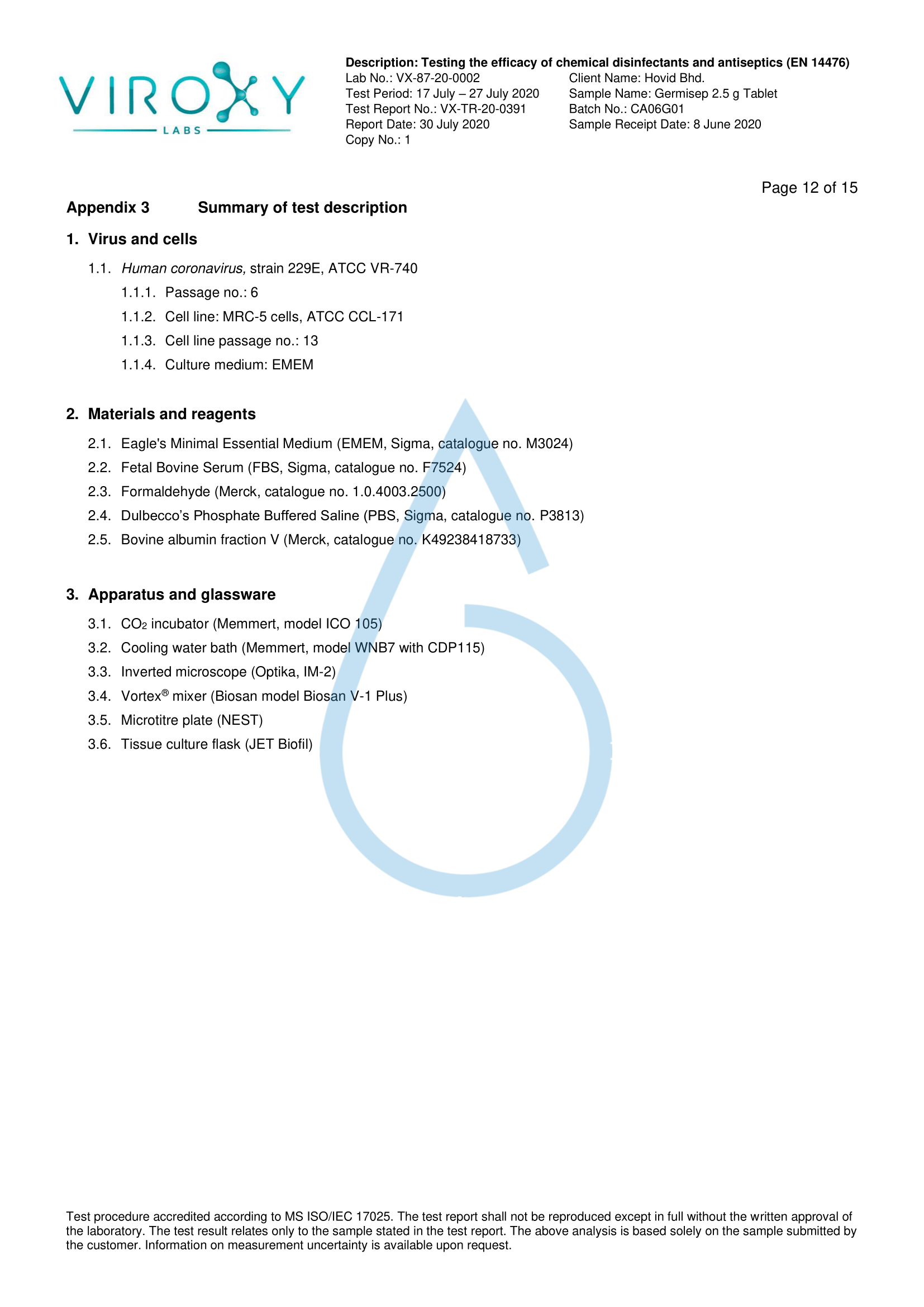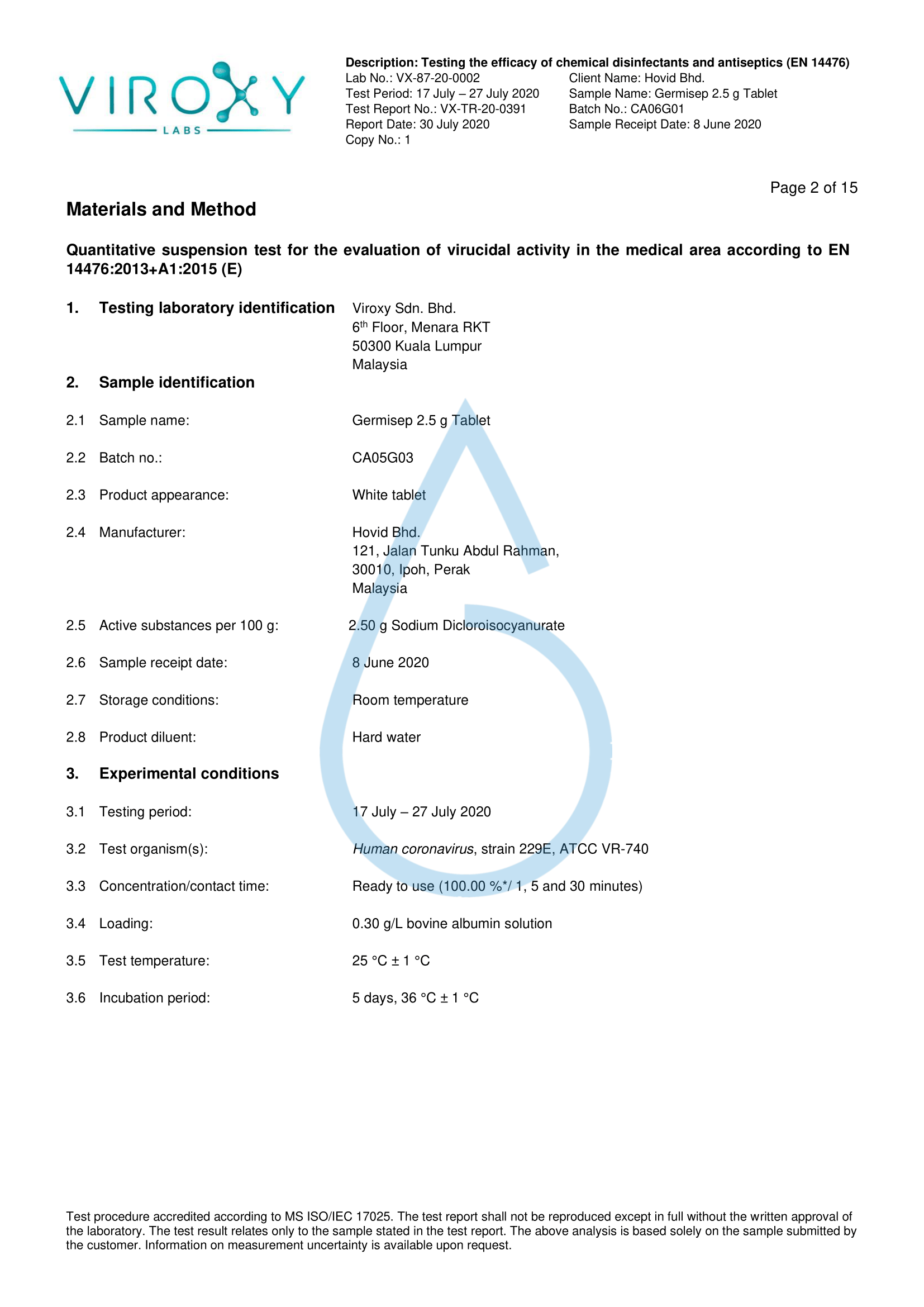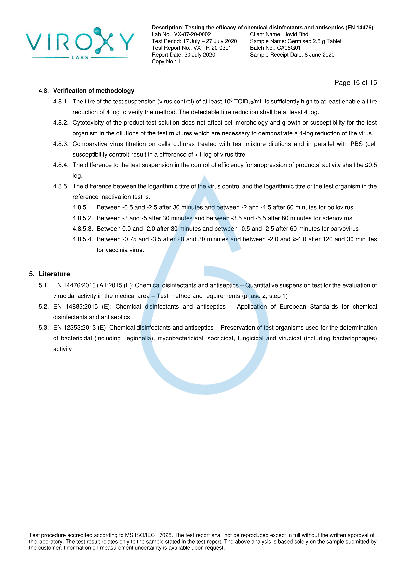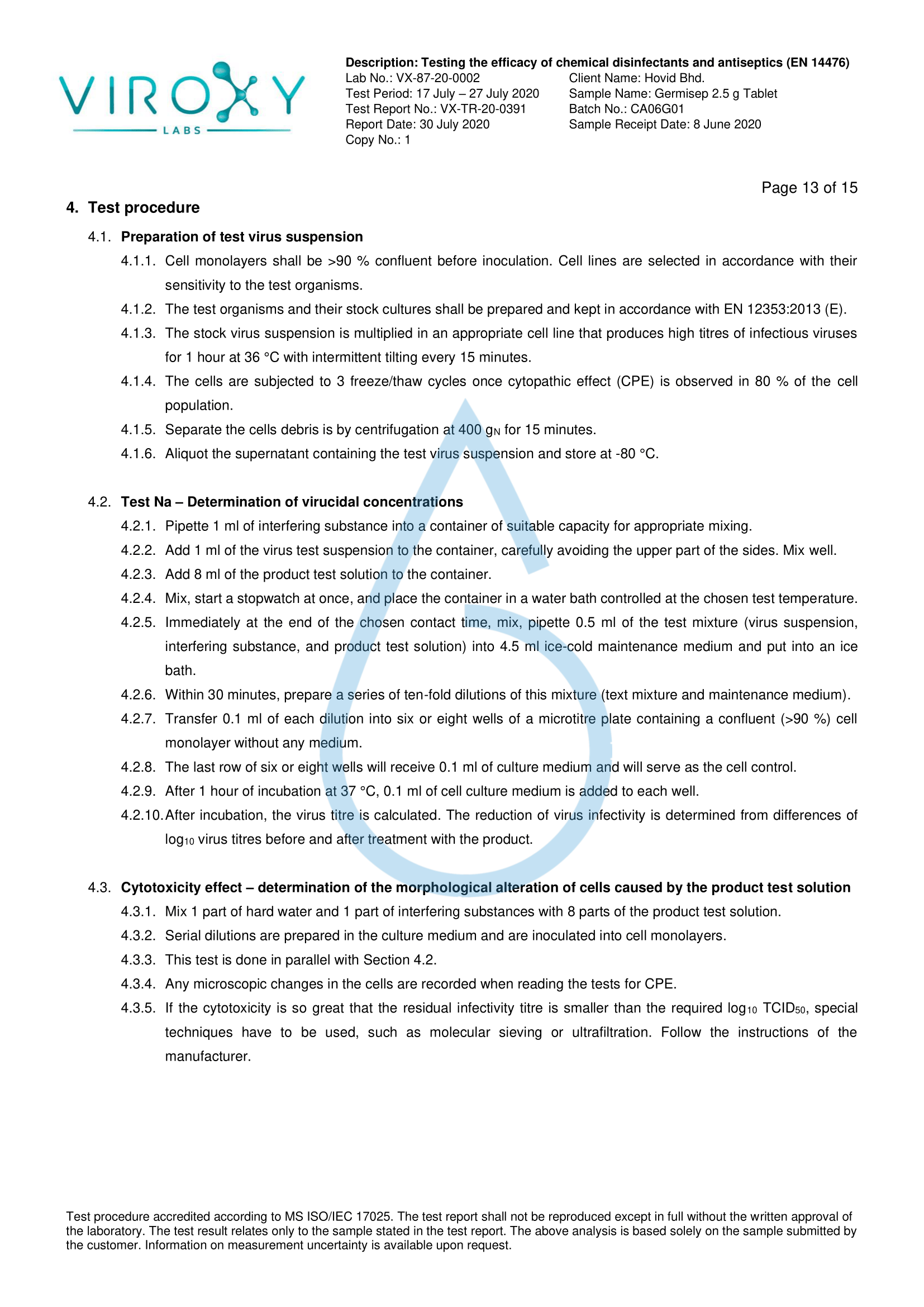 DETERMINATION OF THE VIRUCIDAL ACTIVITY (EN 14476) OF GERMISEP 2.5 G TABLET
