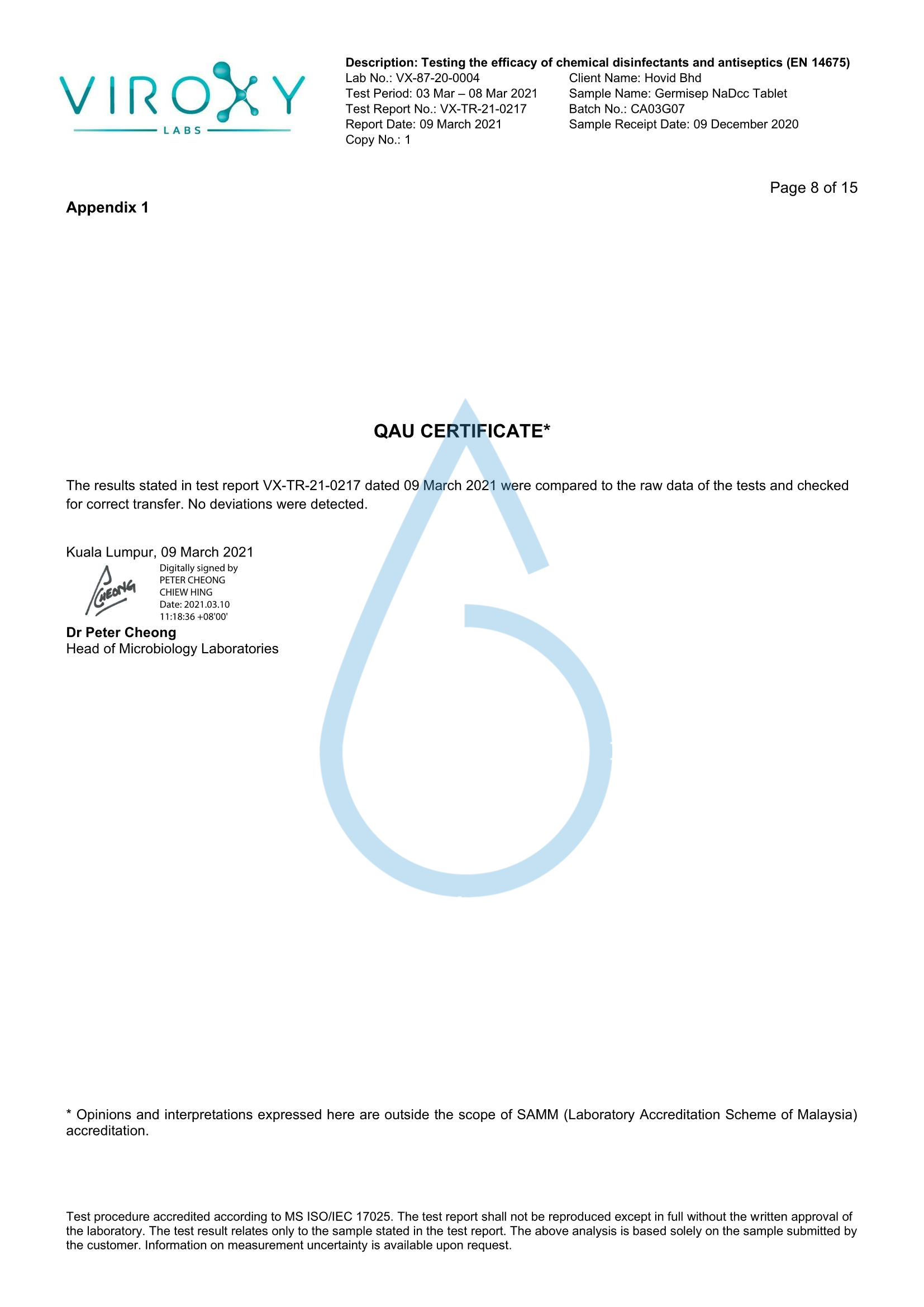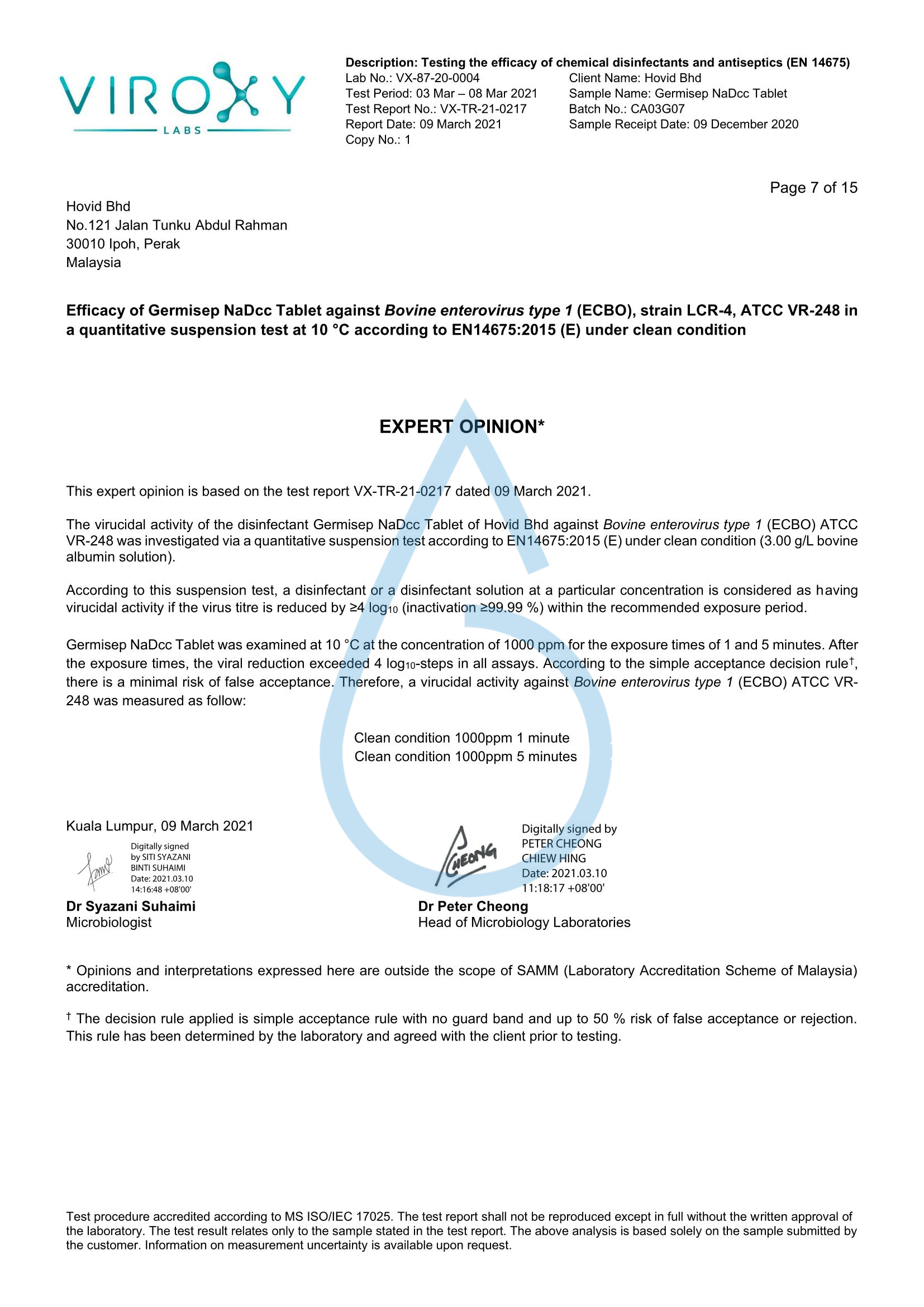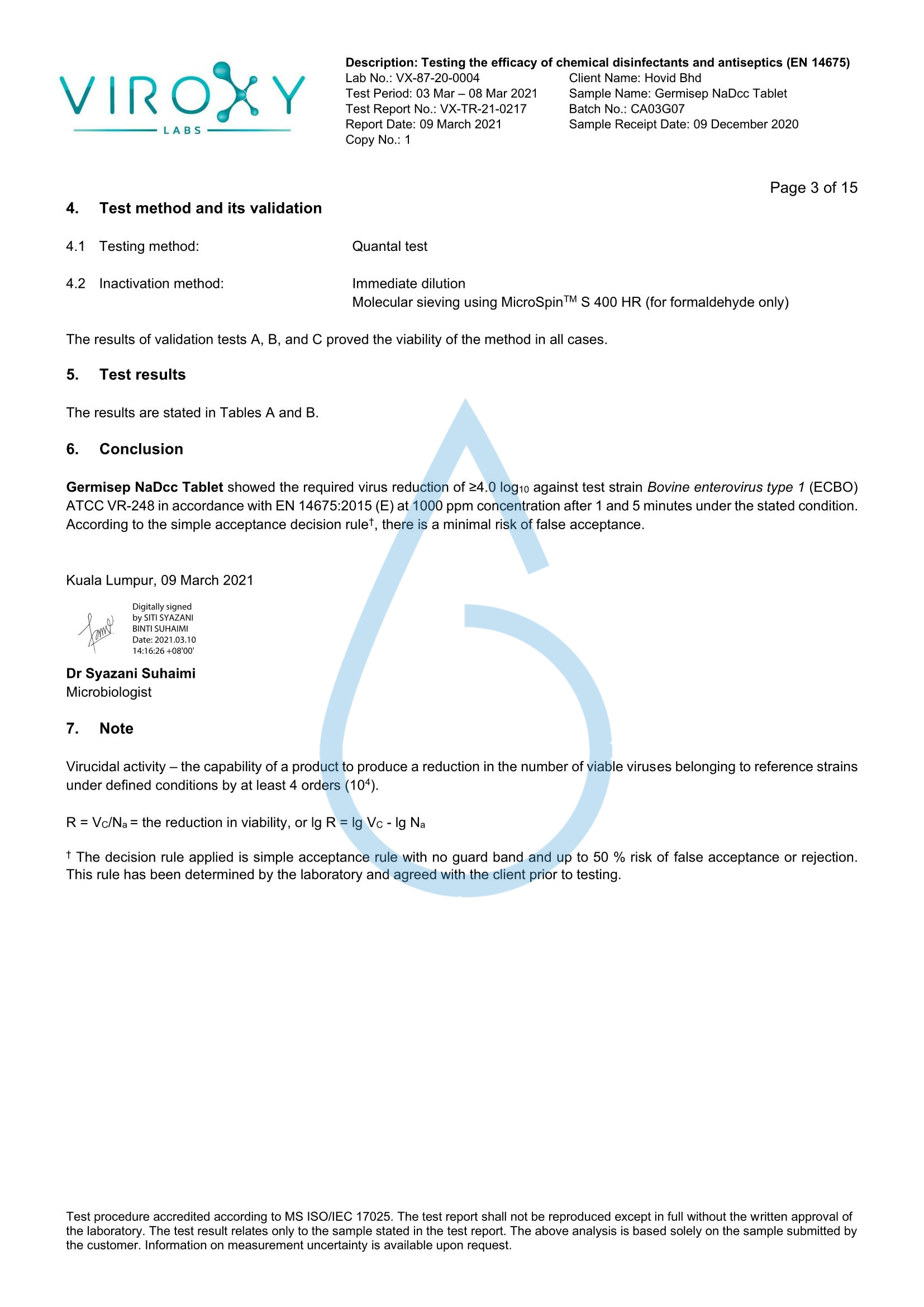 DETERMINATION OF THE VIRUCIDAL ACTIVITY (EN 14675) OF GERMISEP NADCC TABLET - Germisep